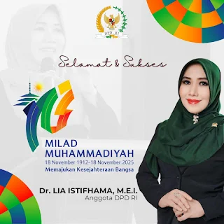 BERITASIBER.COM | JAKARTA – Anggota DPD RI, Dr. Lia Istifhama, M.E.I., mengapresiasi peran ganda Muhammadiyah sebagai kekuatan moral dan mitra strategis pembangunan nasional, dalam rangka peringatan Milad Muhammadiyah ke-113.