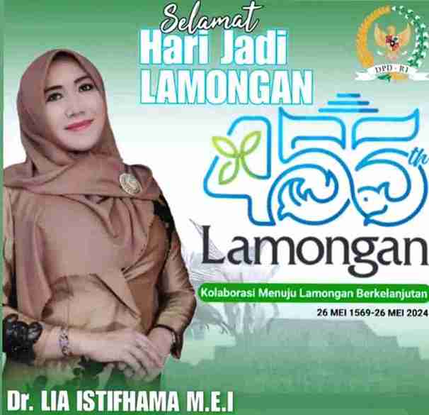 Anggota DPD terpilih 2024-2029 Dr, Lia Istifhama, S.Sos., S.H.I., S.Sos.I., M.E.I. Mengucapkan Selamat Hari Jadi Lamongan (HJL) ke-455