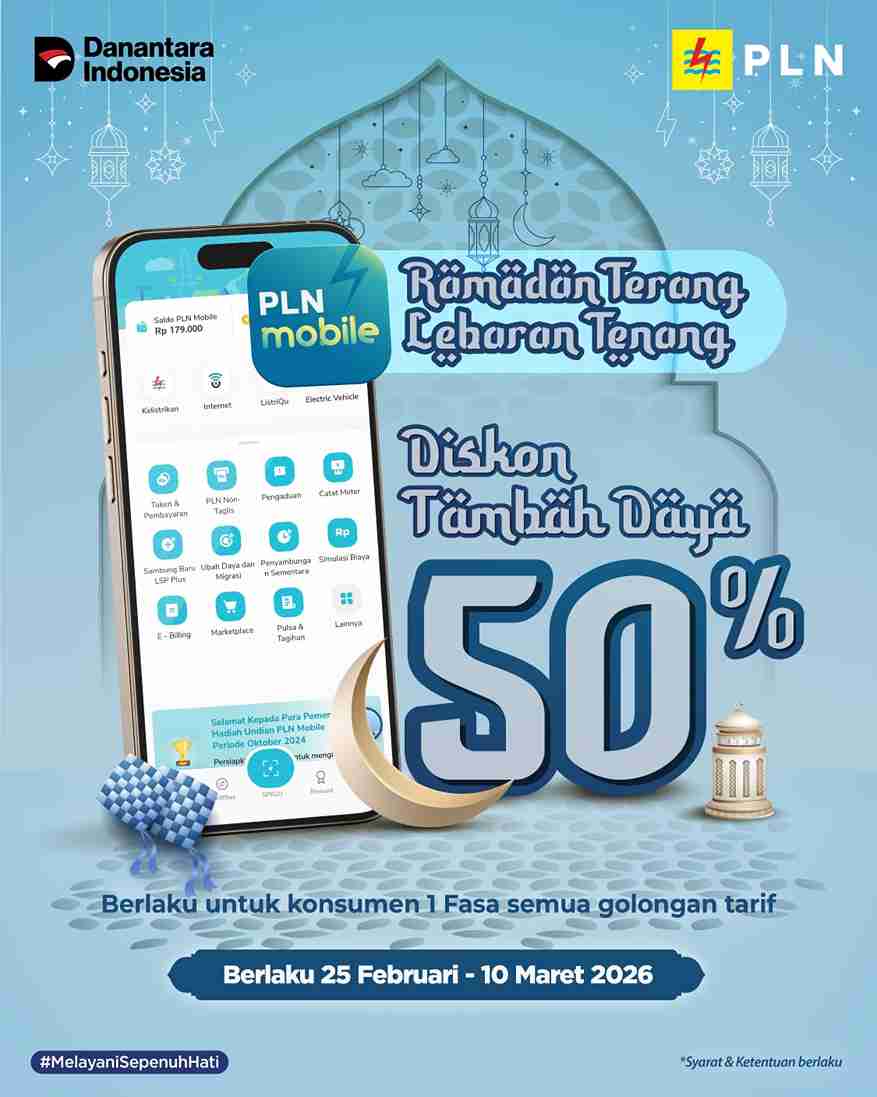 Promo “Ramadan Terang, Lebaran Tenang” ini berlangsung dari 25 Februari hingga 10 Maret 2026, dengan pengajuan hanya melalui aplikasi PLN Mobile untuk meningkatkan kenyamanan penggunaan energi.