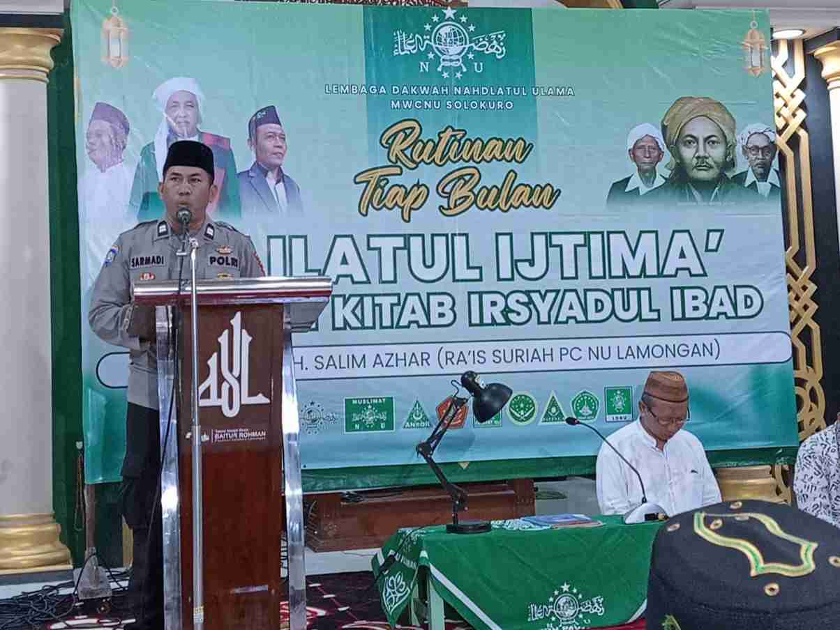 BERITASIBER.COM | LAMONGAN – Dalam rangka mempererat sinergi antara kepolisian dan tokoh agama, Kanit Binmas Polsek Solokuro Polres Lamongan, AIPTU Sarmadi, menghadiri kegiatan Lailatul Ijtima’ yang diselenggarakan oleh MWC NU Ranting Solokuro. Kegiatan tersebut berlangsung di Masjid Jami’ Baiturrahman, Desa Payaman, Kecamatan Solokuro, Kabupaten Lamongan, Jawa Timur.