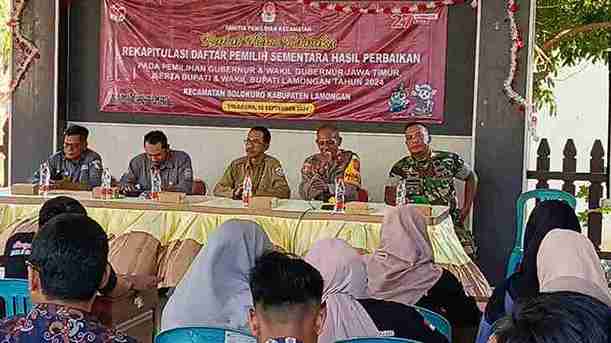 BERITASIBER.COM | LAMONGAN – Kapolsek Solokuro AKP Aris Sugianto, SH bersama Muspika menghadiri Rapat Pleno Penetapan Daftar Pemilihan sementara hasil Perubahan bersama seluruh kepala desa se-kecamatan Solokuro, Bawaslucam, Panwascam dan PPK kecamatan serta undangan di Pendopo kecamatan Solokuro kabupaten Lamongan Jawa Timur.
