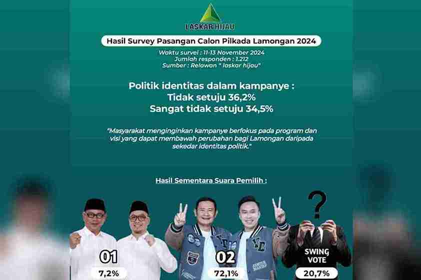BERITASIBER.COM | LAMONGAN – Menjelang Pilkada Kabupaten Lamongan yang semakin dekat, hasil survei terbaru yang dilaksanakan oleh relawan “LASKAR HIJAU” dari tanggal 11 hingga 13 November 2024 memberikan gambaran menyeluruh mengenai preferensi masyarakat terhadap calon bupati dan wakil bupati.