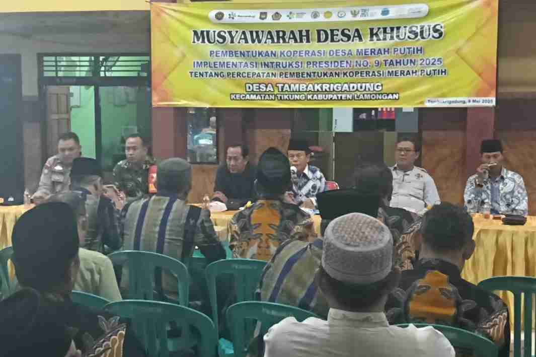 BERITASIBER.COM | LAMONGAN – Pemerintah Desa Tambakrigadung, Kecamatan Tikung, Kabupaten Lamongan, menggelar acara musyawarah desa khusus (Musdesus) pembentukan Koperasi Desa Merah Putih pada Jumat (09/05/2025).