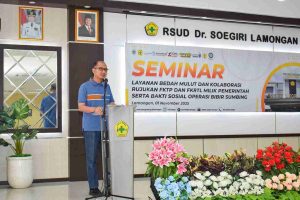 Bupati Lamongan Yuhronur Efendi atau yang akrab disapa Pak Yes, menyampaikan dukungannya saat menjadi narasumber dalam Seminar Layanan Bedah Mulut dan Kolaborasi Rujukan FKTP-FKRTL di Aula RSUD dr. Soegiri Lantai 3, Sabtu (1/11/2025).