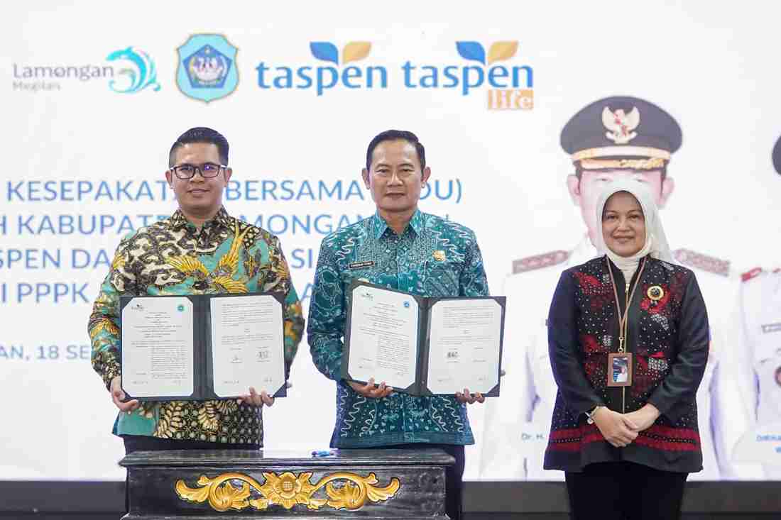 BERITASIBER.COM | LAMONGAN – Pemerintah Kabupaten (Pemkab) Lamongan resmi menandatangani Memorandum of Understanding (MoU) dengan PT Asuransi Jiwa Taspen (Persero) pada Kamis (18/9) di Pendopo Lokatantra. Kerja sama ini bertujuan memberikan perlindungan asuransi bagi Aparatur Sipil Negara (ASN), khususnya Pegawai Pemerintah dengan Perjanjian Kerja (P3K) di lingkungan Pemkab Lamongan.