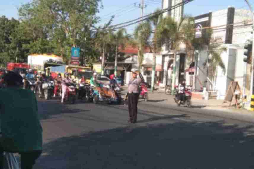 Personel yang bertugas mengarahkan pengendara agar tertib dan memprioritaskan keselamatan pejalan kaki di area tersebut.
