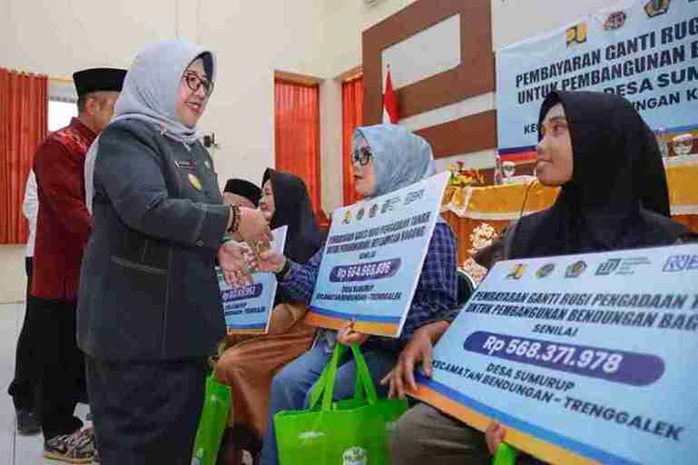 BERITASIBER.COM | TRENGGALEK – Bertempat di Aula Dinas PUPR kabupaten Trenggalek, Penjabat Sementara (Pjs.) Bupati Trenggalek, Dyah Wahyu Ermawati menyerahkan secara simbolis uang ganti rugi untuk 39 warga terdampak Pembangunan Proyek Strategis Nasional (PSN) Bendungan Dam Bagong.