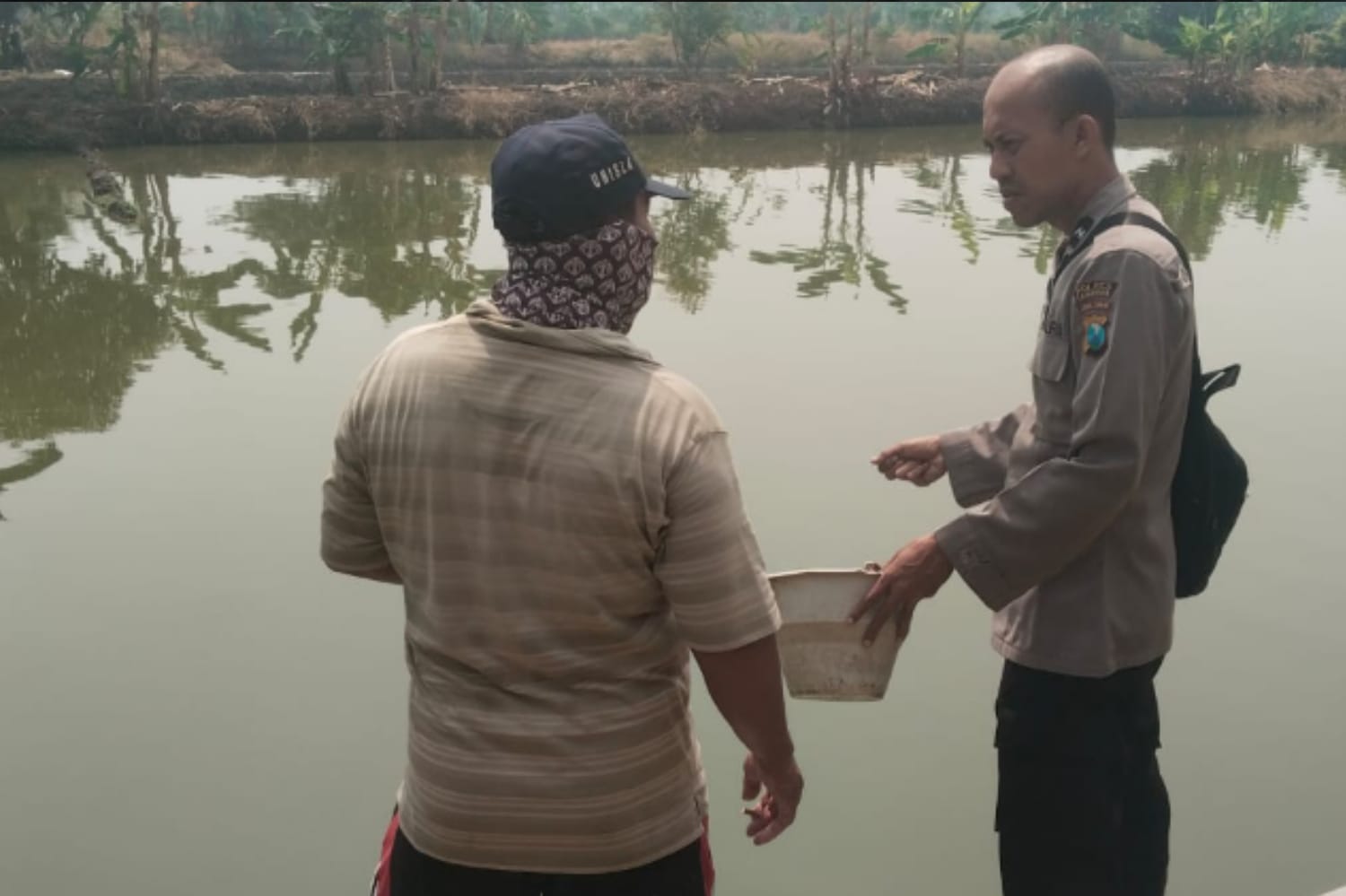 Bersama petani, personel Polsek Deket bantu memberikan pakan ikan nila di lahan tambak milik warga.