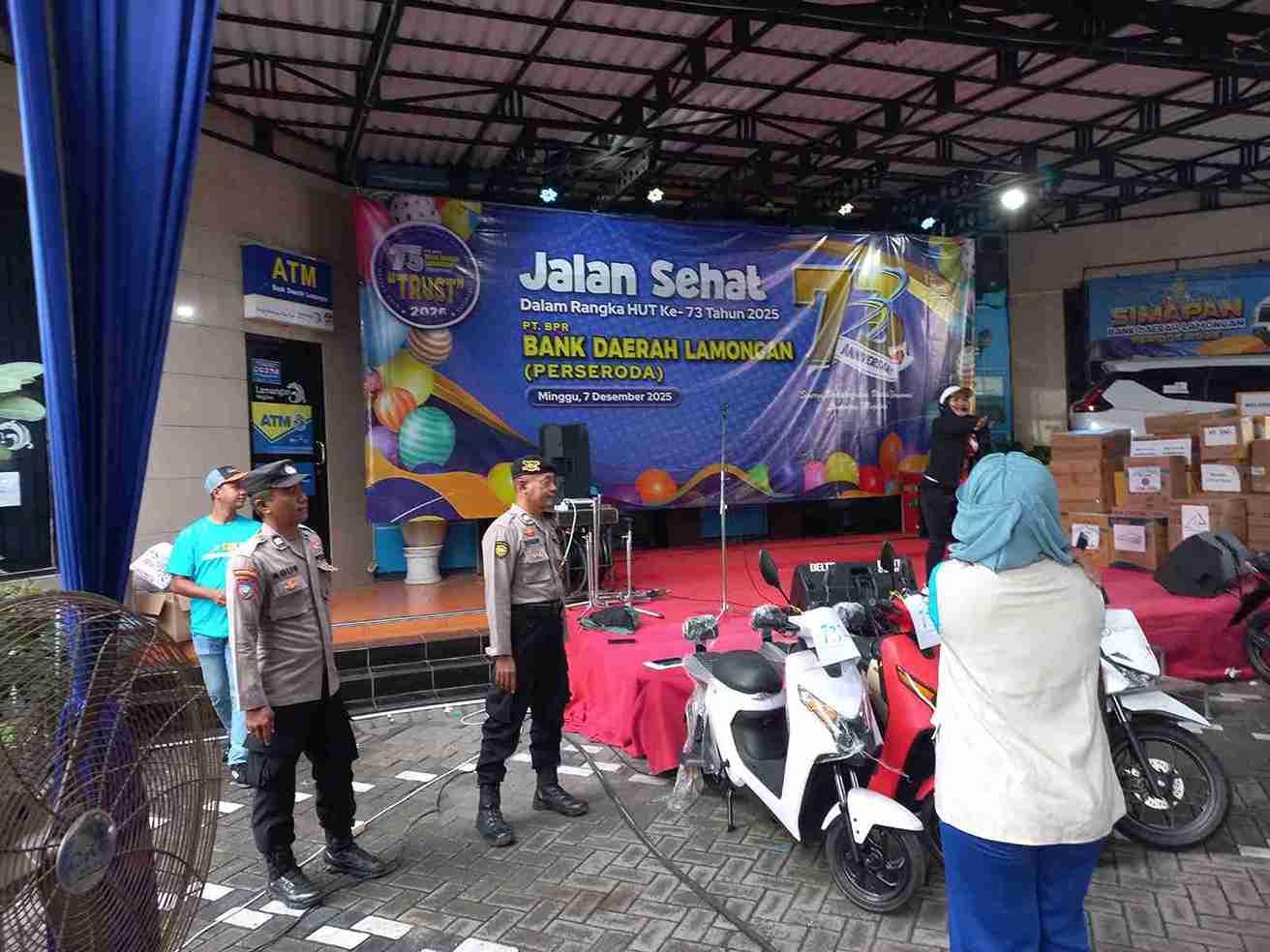 BERITASIBER.COM | LAMONGAN — Polsek Lamongan Kota Polres Lamongan Polda Jawa Timur melaksanakan pengamanan kegiatan jalan sehat dalam rangka memperingati HUT Bank Daerah Lamongan ke-73, Minggu (7/12/2025).