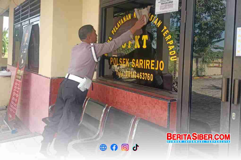 BERITASIBER.COM | LAMONGAN – Anggota Polsek Sarirejo melaksanakan kegiatan bersih-bersih dan penyemprotan disinfektan di ruang pelayanan dan area lainnya di Mapolsek Sarirejo.