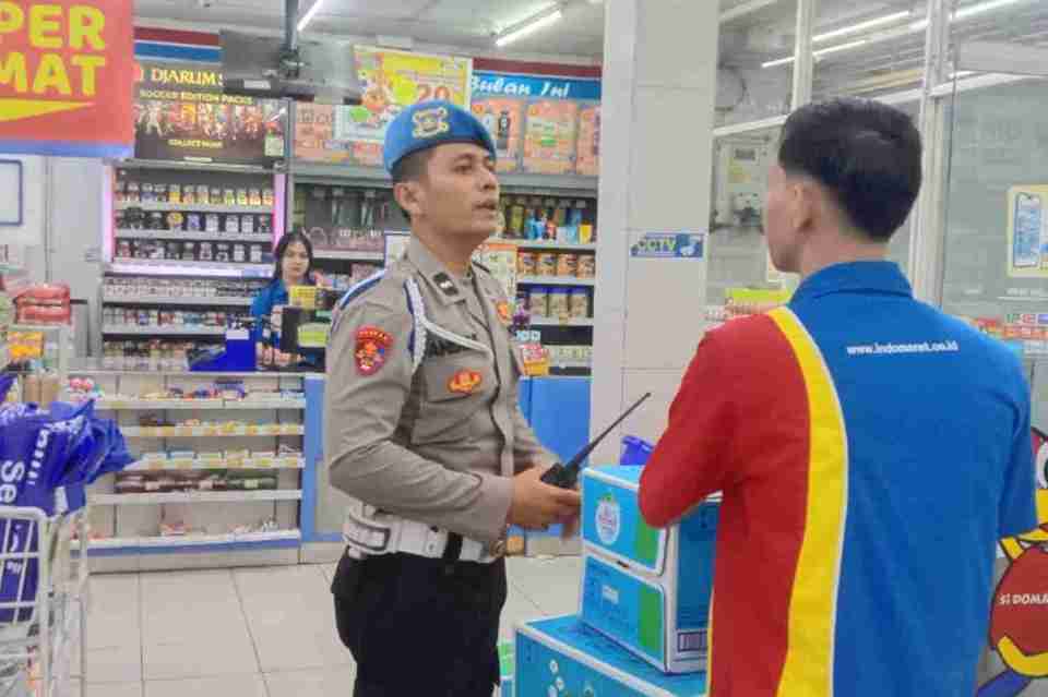 Dalam kegiatan patroli ke pertokoan anggota Polsek Lamongan Kota menyempatkan sambang ke toko Indomaret dan dialogis dengan karyawan yang melaksanakan tugas.