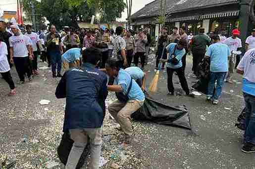 BERITASIBER.COM | KEDIRI – Sejumlah pendukung pasangan calon wali Kota Kediri Vinanda Prameswati – KH. Qowimuddin Thoha (Gus Qowim) membersihkan sampah usai pengambilan nomor urut di Grand Panglima Kediri, pada Senin sore (23/9/2024).