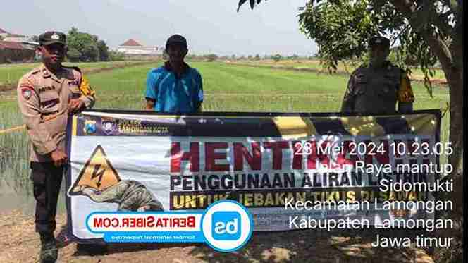 Kali ini seperti dilakukan Panit 2 Samapta Polsek Lamongan Kota Polres Lamongan Aipda Agus Susanto dkk binluh kamtibmas sosialisasi larangan jebakan tikus dengan menggunakan listrik disawah, Kamis (23/05/2024).