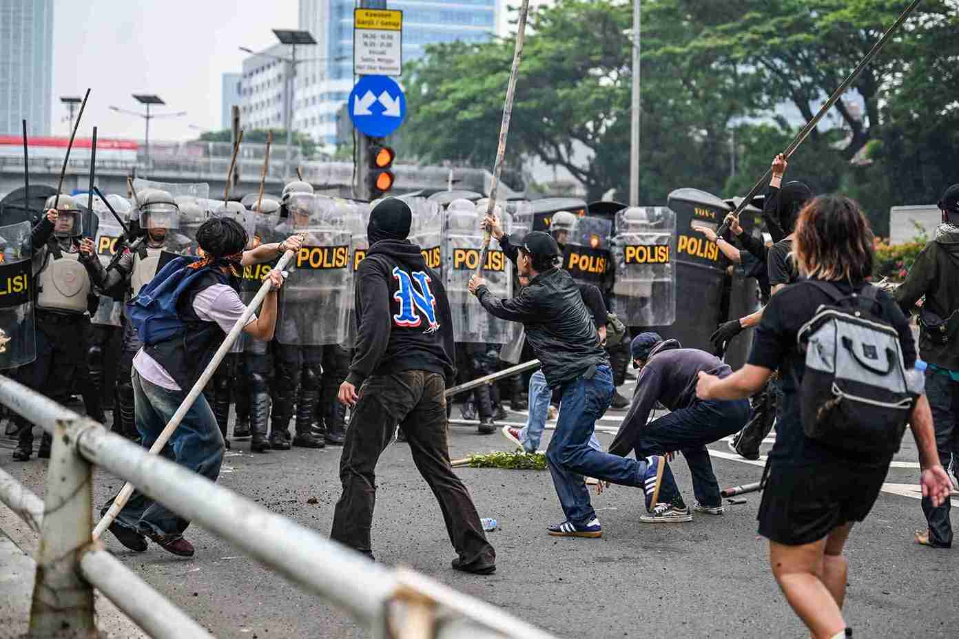 Situasi memanas saat beberapa demonstran melemparkan batu, petasan, hingga botol molotov ke arah petugas dari atas rel kereta. Sebagai respons, polisi membalas dengan menembakkan gas air mata secara bertubi-tubi, mendorong mundur massa ke arah Flyover Slipi dan Jalan Gelora.